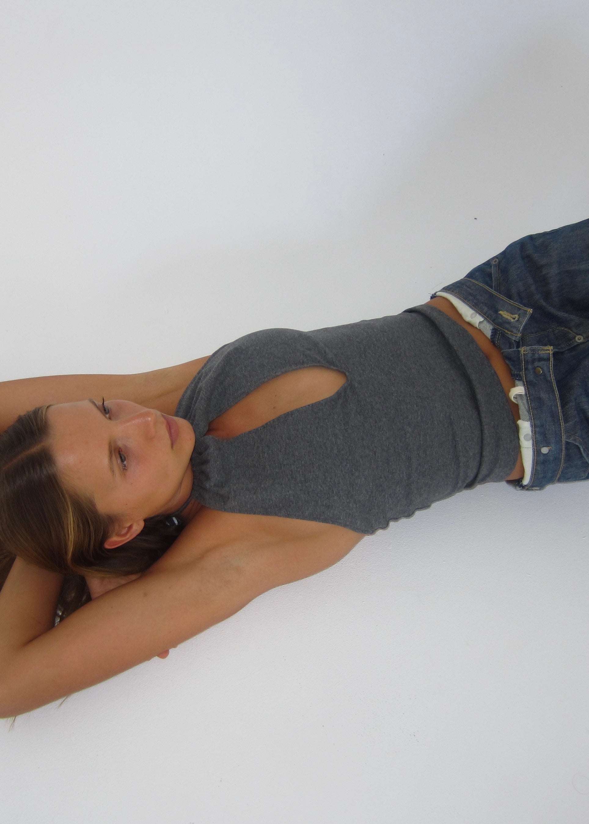 Grey cut out halter top. Open back with a delicate tie closure. Tight fit. Soft cotton material. Lightweight, breathable with a slight stretch.