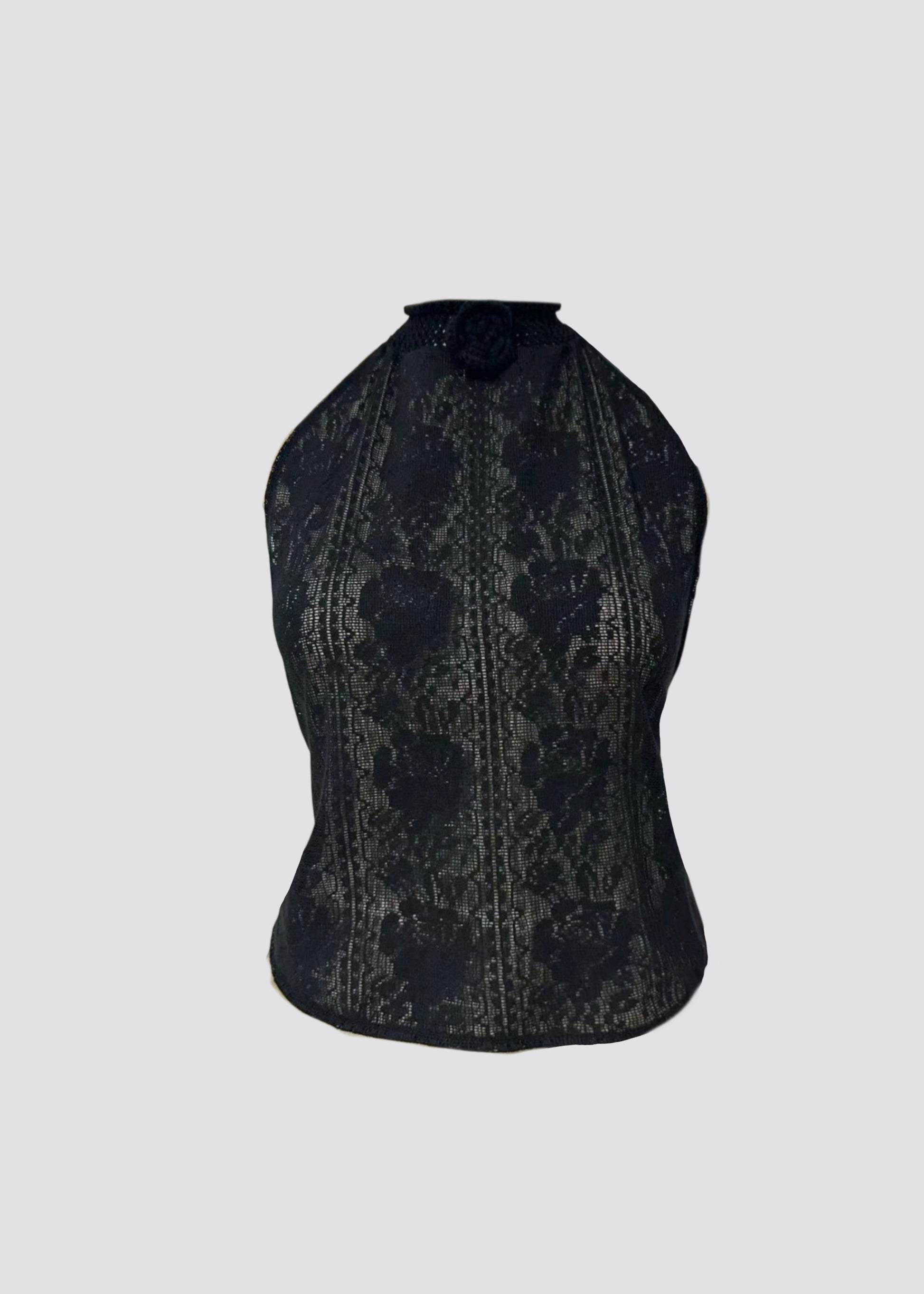 The Larissa Rose Halter features delicate vintage black lace paired with a hand-crocheted flower accent at the neckline. The adjustable tie-back and neck ensure a perfect fit, making this piece as versatile as it is captivating. Effortless, a timeless statement for any occasion.