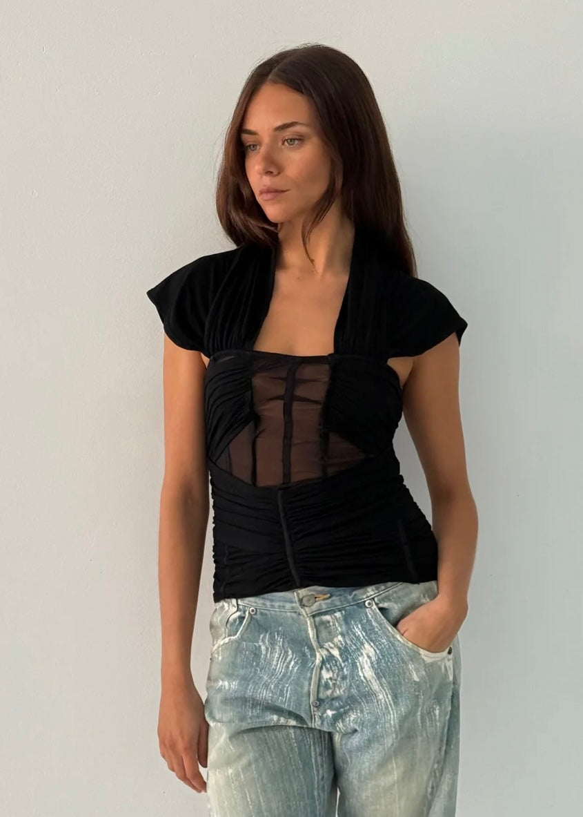 The perfect date night halter top. Black halter mesh corset top with simple flattering vertical wire boning. Back zipper, can be worn multiple ways.
